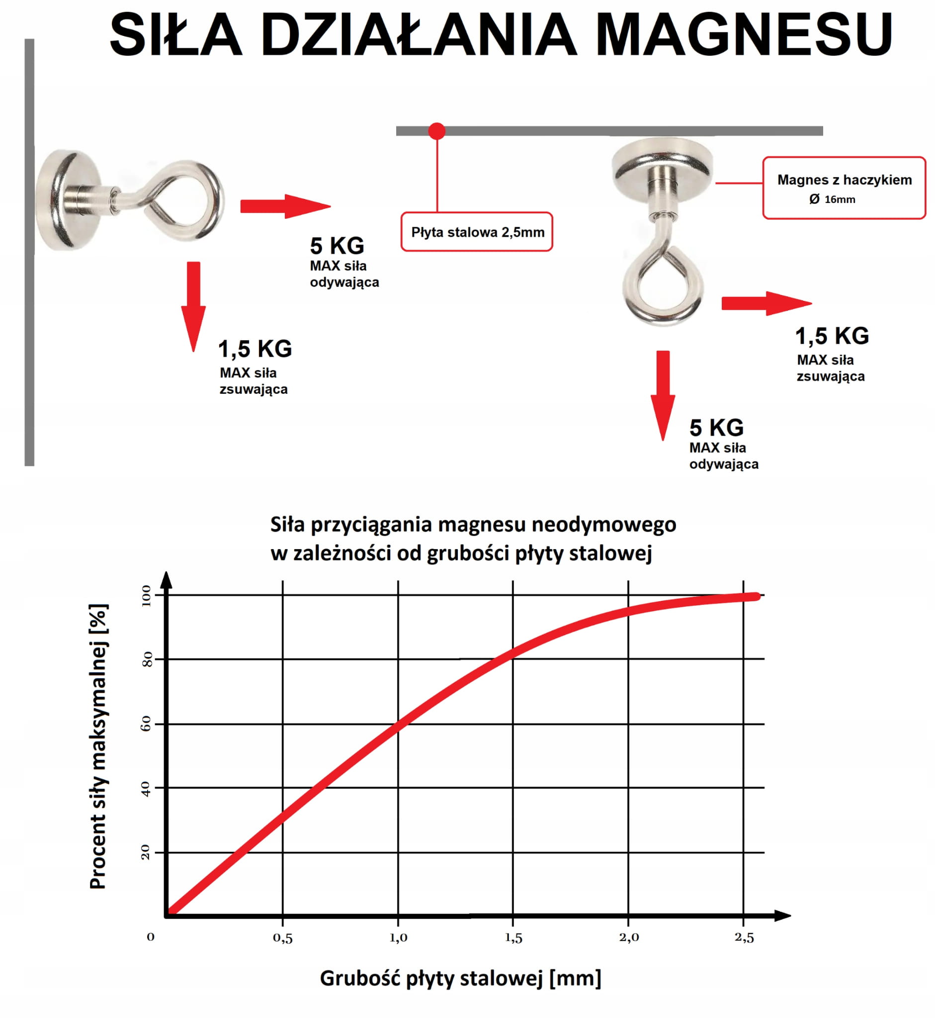 Uwaga: Na Udźwig maksymalny uchwytu ma wpływ kilka czynników, zalecane jest sprawdzenie uchwytu w konkretnych warunkach. Proszę pamiętać o osuszeniu uchwytu po kontakcie z wodą. Proszę o zapoznanie się z bezpiecznymi zasadami użytkowania magnesów : https://www.neomagnesy.pl/pl/i/Zasady-bezpieczenstwa/22