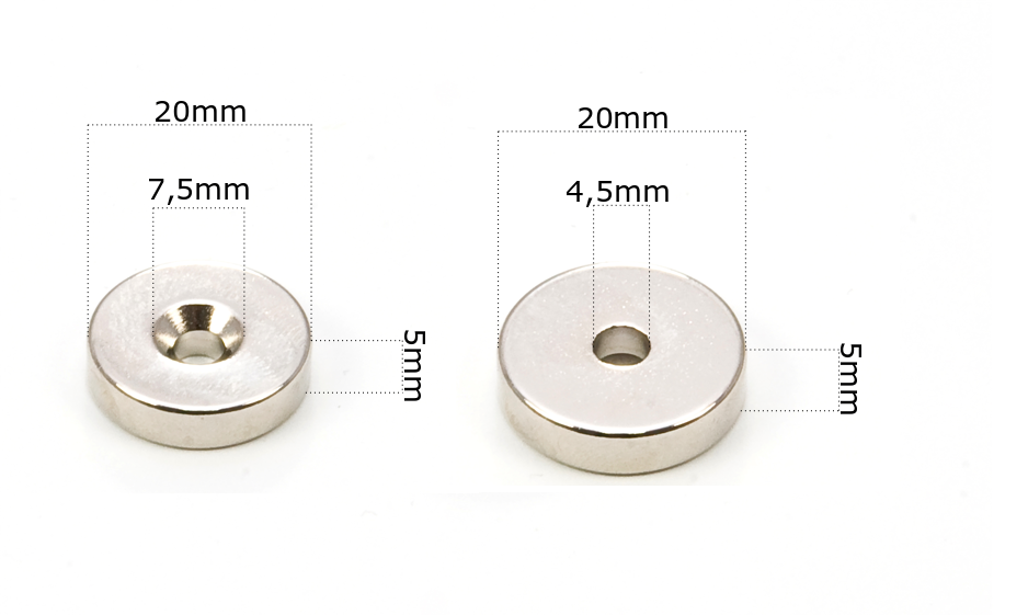 Magnes Neodymowy 20x7,5/4,5x5 z otworem stożkowym pod wkręt o mocy N42