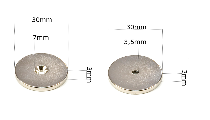 Magnes Neodymowy 30x7/3,5x3 z otworem stożkowym pod wkręt o mocy N42