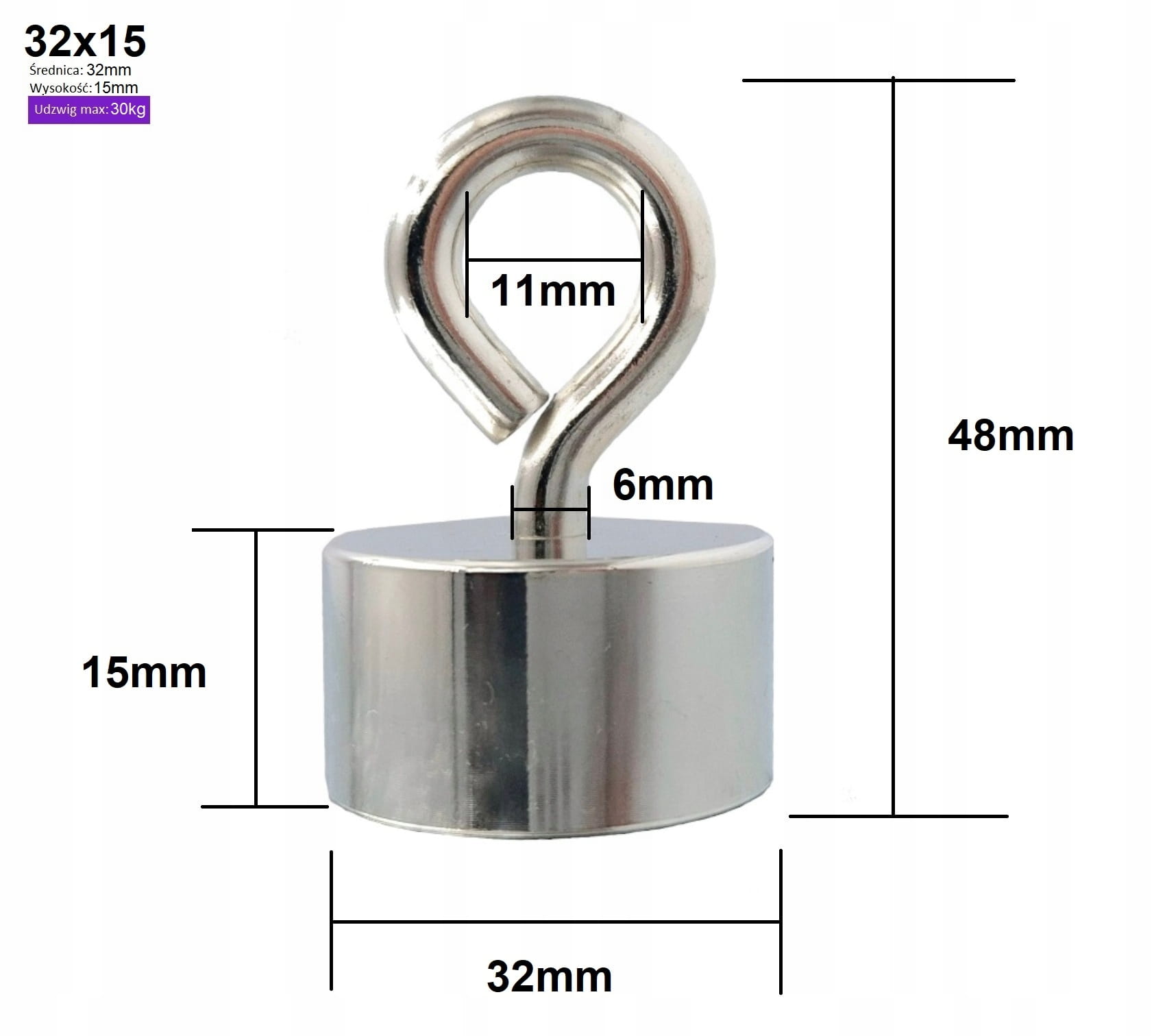 Parametry magnesu 32x15 z uchwytem: